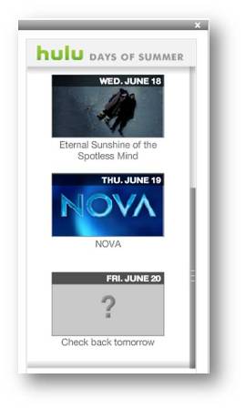 “Hulu Days of Summer” launches a premiere program every weekday through mid-August. So far, Hulu’s put out Lost in Translation (great movie), a Three Stooges collection, Eternal Sunshine of the Spotless Mind, and today’s debut, a long line-up of NOVA shows. I know the gimmick sounds pretty standard, but Hulu’s adding a twist: a Hulu Days of Summer Widget along with an RSS feed. Brilliant move for the all the Web entertainment sites that track this kind of thing.
