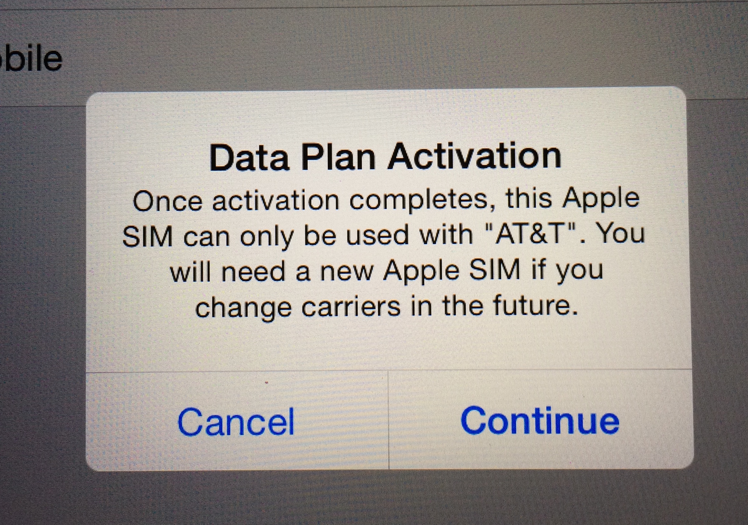 So the Apple SIM theoretically saves Apple some packaging expenses and provides us, the end users, with amazing flexibility – buy the iPad and choose whichever carrier we want at any point after we get it home. And, down the road, we’d be free to flip carriers as coverage or pricing changes. It’s a grand, consumer friendly vision. However, the future hasn’t quite arrived. Due, once again, to short-sighted carrier protectionism (and technical glitches).
