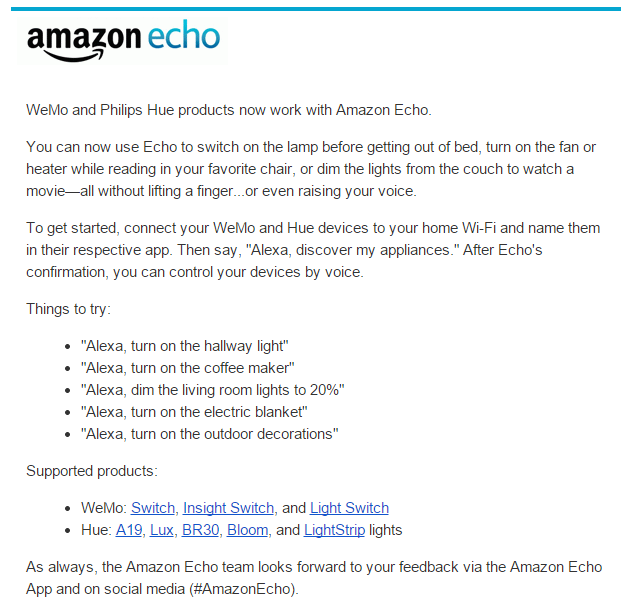As always, the Amazon Echo team looks forward to your feedback via the Amazon Echo App and on social media (#AmazonEcho).