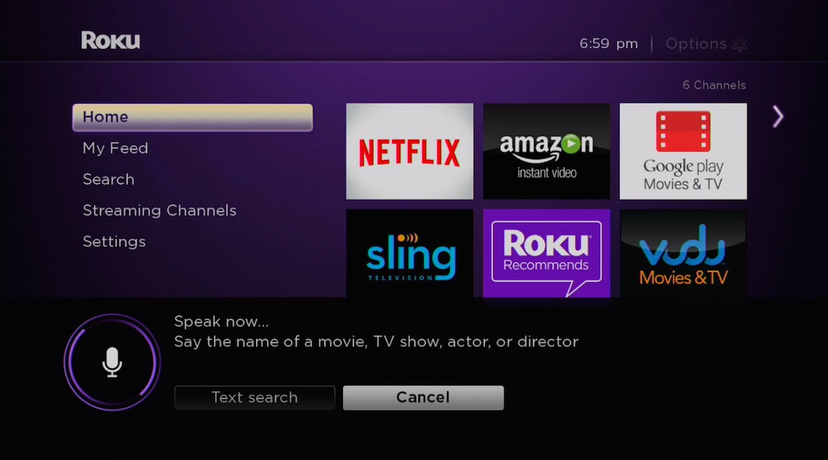 The 2015 Roku 3 ships with a new “Enhanced Remote” that includes a new magnifying glass button and microphone to power voice search, à la Amazon Fire TV and even Comcast Xfinity. When the magnifier is pressed, the lower third of the Roku screen indicates the remote is listening for movie, TV show, actor, or director – tying into Roku’s top-notch universal search across disparate video content providers.