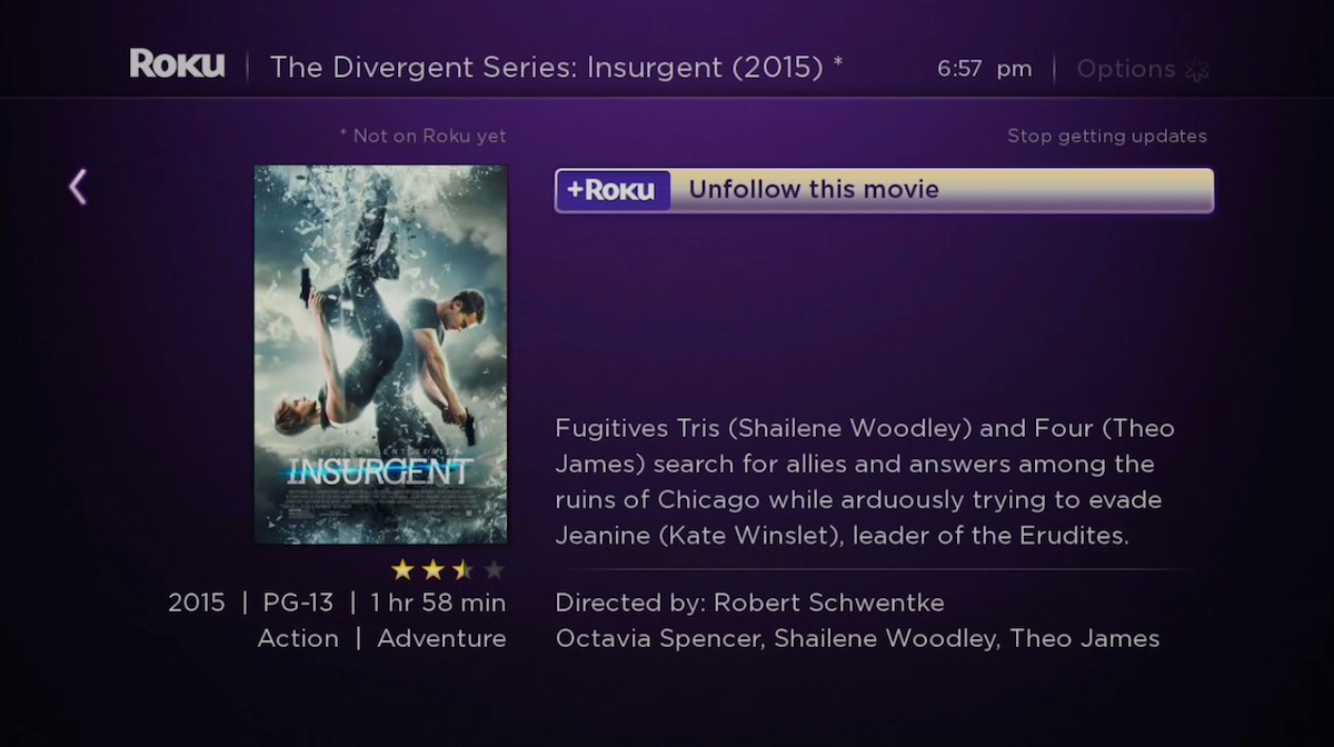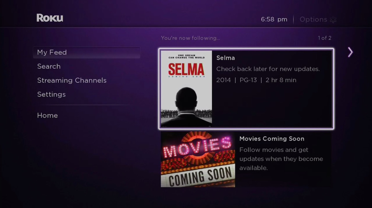 Along with the introduction of the 2015 Roku 2 & 3 comes the new “Roku Feed” feature. At launch, it’s pinned to the Roku home screen as My Feed and provides an interface to “follow” new movies – easily keeping tabs on when a title moves from the big screen to a digital rental or purchase, along with sale updates. The area is a bit spartan at the moment and sadly Roku’s fantabulous universal search doesn’t yet integrate with upcoming releases – so new movies must be manually browsed. But we imagine this functionality will ultimately integrate tighter with Roku Search, including voice, and perhaps content-beyond-movies will be included. Heck, there’s still room for agnostic video playlists.