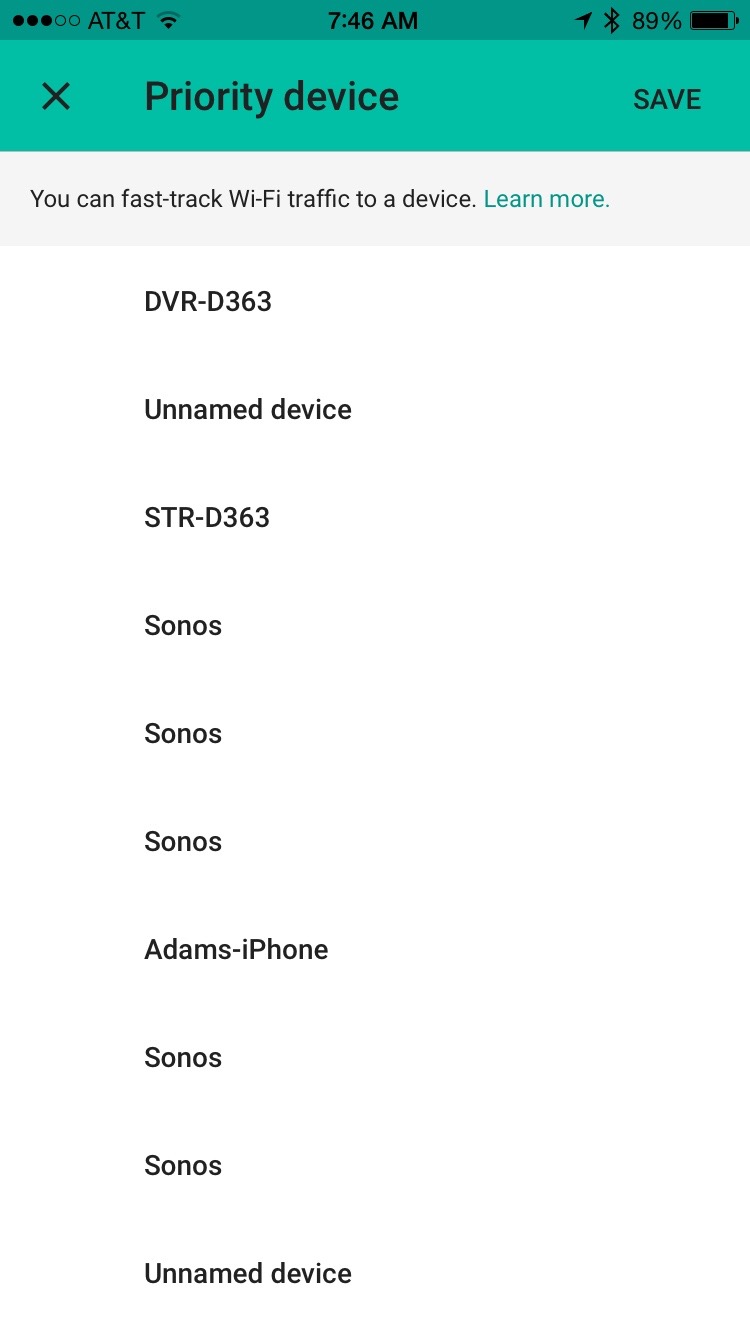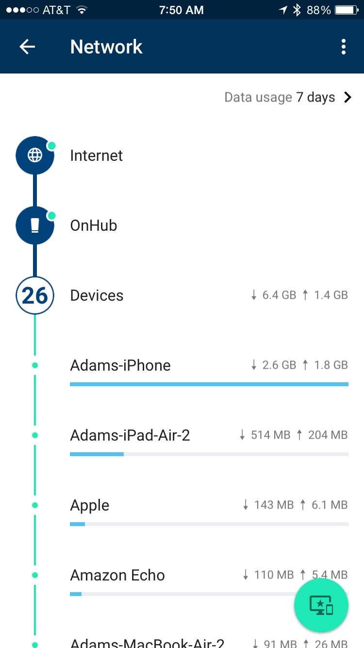 Clicking on the device count will show you a list of all your devices. One thing I immediately noticed was the stats for devices. You have the ability to see in real-time how much bandwith your current devices are using. You also have the option to show the previous hour, 7 days, or 30 day timeframe. For those on a data cap from your ISP, this provides valuable information. I will be interested to see how much data we actually use over the next month.