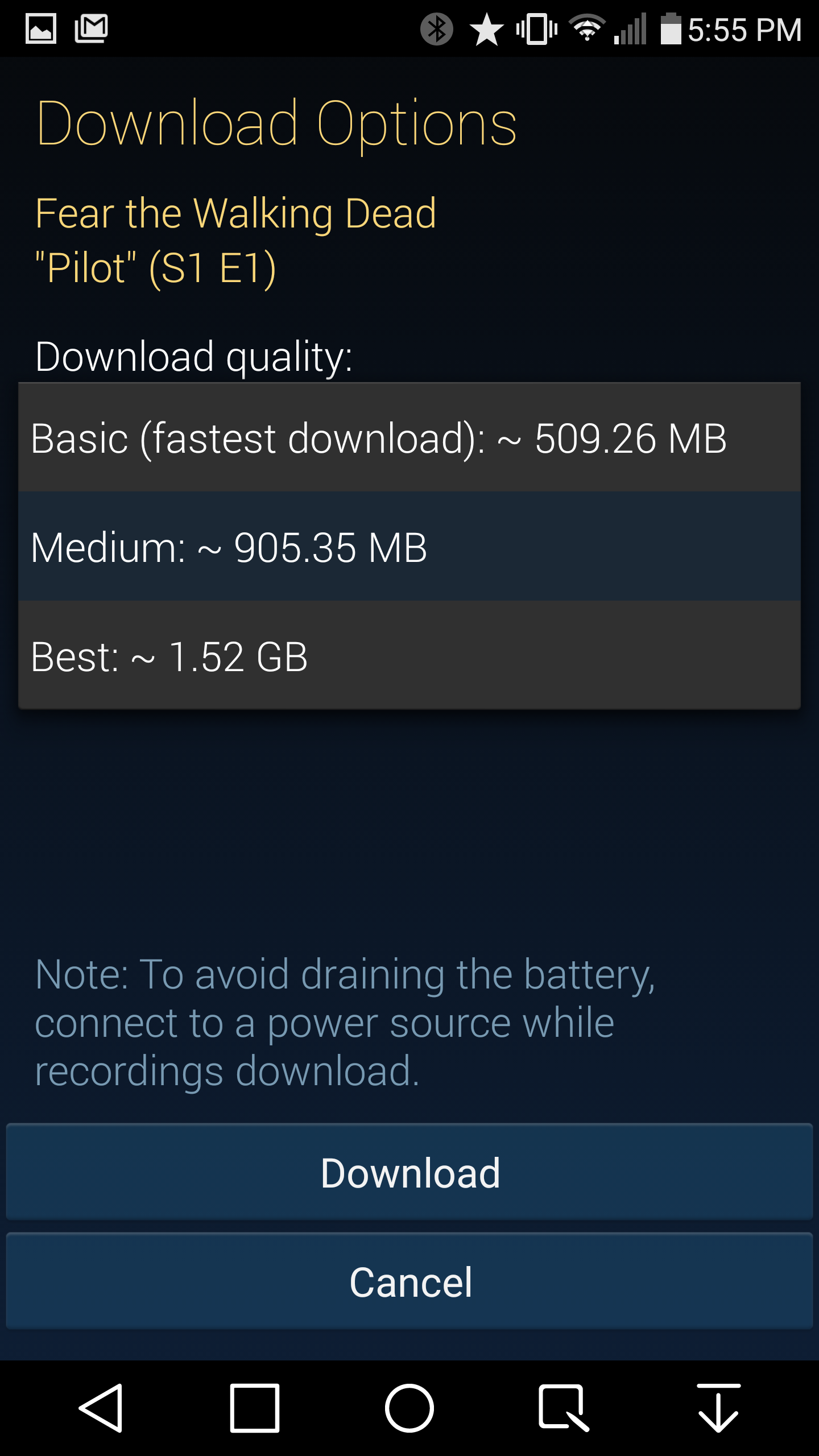 So, it looks like this download feature is going to be pretty useless on my 2GB phone. I had to move some things around just to be able to download a 30 minute show. I would have to delete several apps to be able to download a one hour show. And downloading a 90 minute movie is never going to happen.