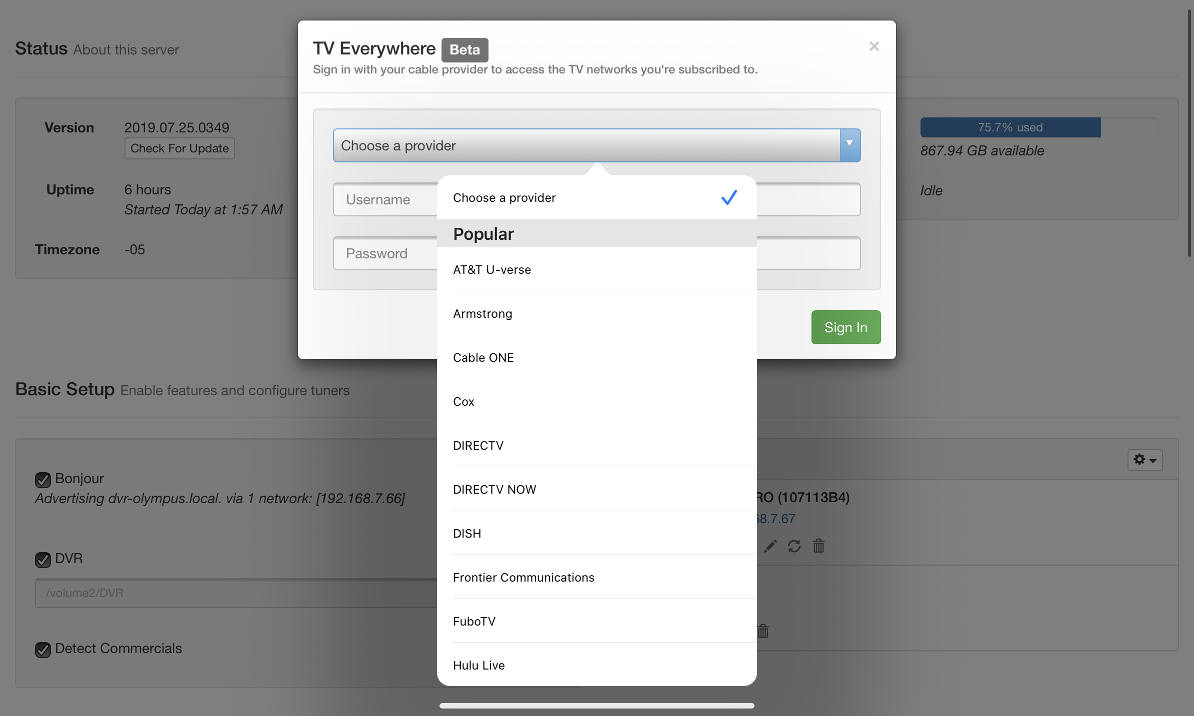 With today’s Channels TV Everywhere release, Channels now allows you to add pay television as a source for viewing and recording! The feature comes as a public beta for Channels Plus members looking to help expand testing. To get started, you need to make sure you are on the latest release of the Channels server software. From there, you simply add a new TV Everywhere source from the admin screen. Login with your existing provider (Direct TV in my example), and Channels will pull in all the available channels from that source. Once your guide data has been updated, you’ll be able to access these new channels immediately and best of all, they are available to record! Channels, now with or without tuner hardware in the home.