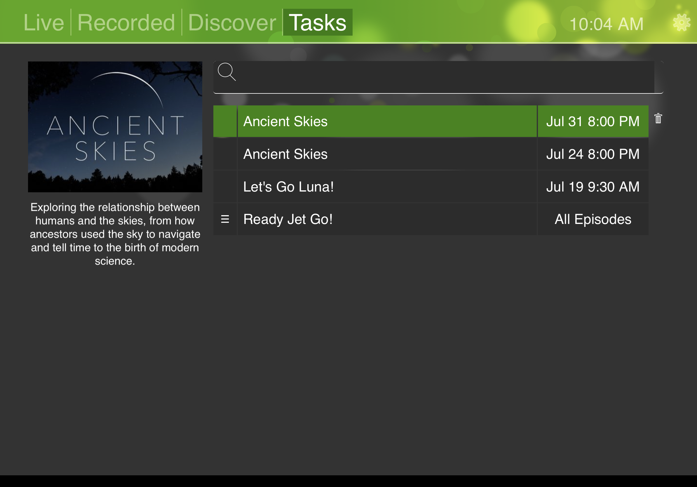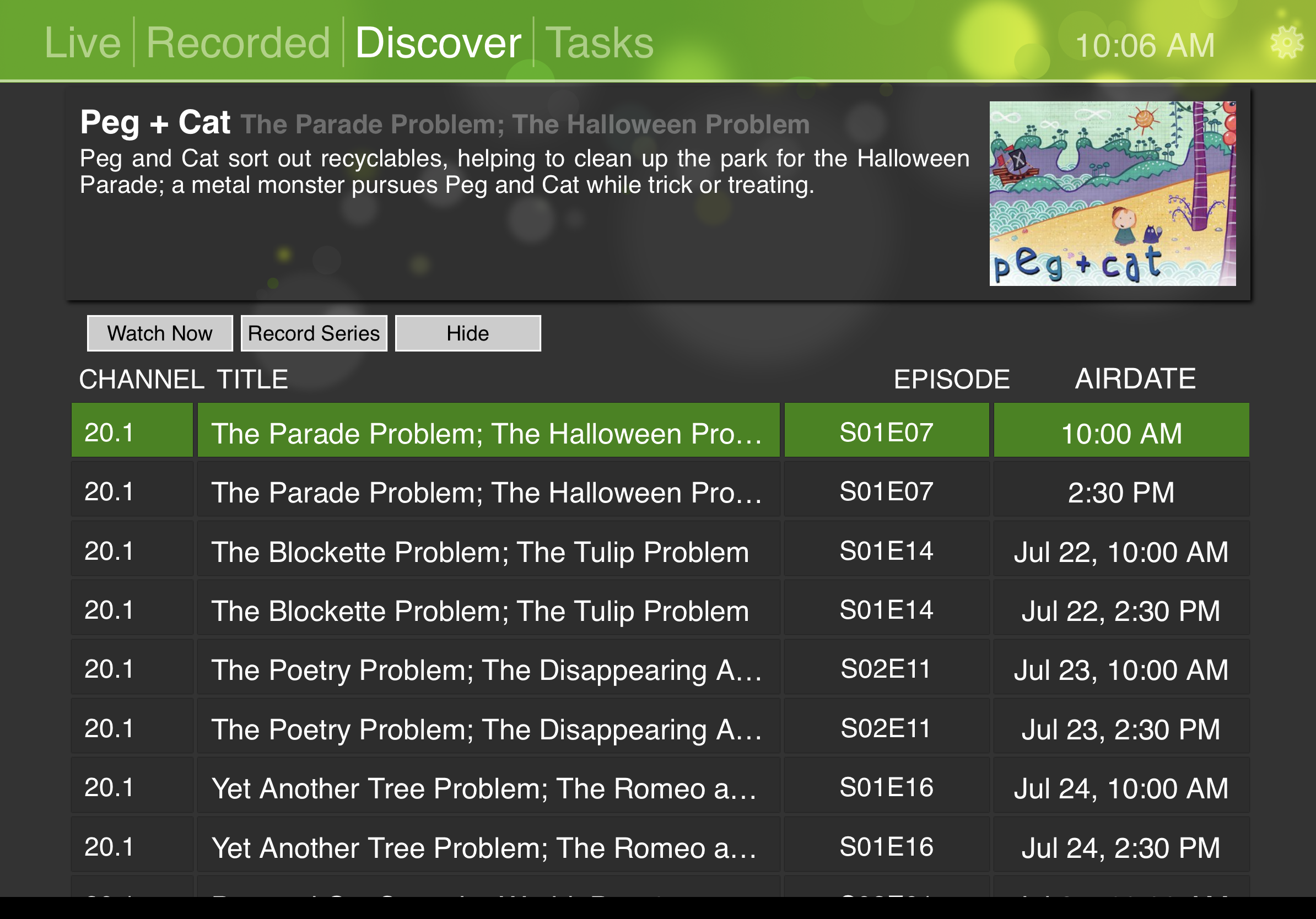 When watching live television, you are able to easily click the record button to start a recording to the Servio. Clicking the list button at the bottom right will take you to the main interface which features a Live, Recorded, Discover, and Tasks tab at the top. The Recorded tab shows all your existing recordings and by selecting a recording, you can see all the recordings for that specific show. Selecting the Discover tab will give you a view of all the currently now playing shows while allowing you to move ahead in time to see upcoming shows. When you’re in a show within the Discovery tab, you are then able to select a specific show to see upcoming episodes and choose which ones to record simply by selecting the specific recording or choosing to record the entire series. Recording a series only gives you a “Record All Episodes” or “Record Current Season”. There doesn’t seem to be a way to do a record all, but skip duplicates. Lastly there is the Tasks tab which provides an overall view of your recording schedule and the ability to delete or rearrange the priority of a task (recording).