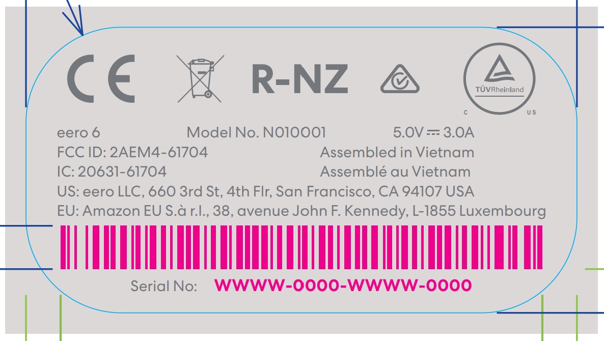 The eero Pro 6 (product packaging above) continues the line’s aesthetic, merging elements of the original eero design and footprint with the the lower-end cupcake’s sloped top surface. Based on the joint filing and FCC regulatory photo, the eero 6 hub and access point could share the same enclosure (goodbye Beacon form factor?)… but we only have one bottom view to go on – and this bottom differs from the Pro.